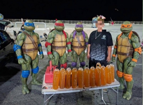 据泰国媒体报道,来自春武里府的警方在打击非法销售卡痛叶水的行动中,特意身穿“忍者神龟”卡通服装进行伪装,突袭位于邦帕莱区一座桥附近的目标店铺。